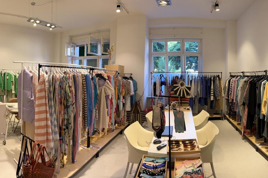 Präsentationsmöglichkeiten: Der Showroom ist komplett eingerichtet mit Kleiderstangen und Präsentationsflächen, die Sie flexibel nach Ihren Bedürfnissen nutzen können.